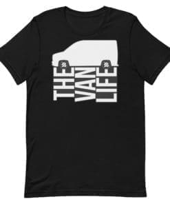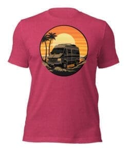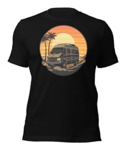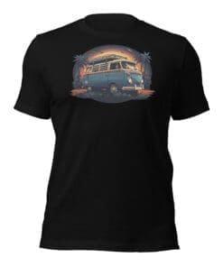 The “Sunset Vanlife” T-shirt resonates with the soft rustling of leaves, the lapping waves against the shore, the crunch of gravel under tires, and the peaceful silence of the night under the stars.