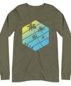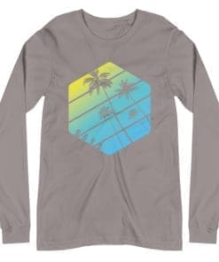 Printed on a premium-quality Long Sleeve Tee, it features a hexagonal frame capturing a mesmerizing scene of the ocean at sunset, where the brilliant yellow slowly gives way to a calming blue, complemented by the silhouettes of palm trees adding a tropical charm.