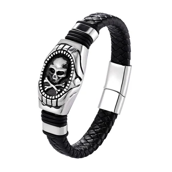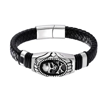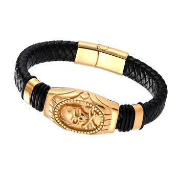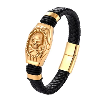 The ‘Jacob’ Stainless Steel Skull Leather Bracelet is a bold statement piece that captures the essence of edgy sophistication. This striking accessory features a meticulously crafted gold-toned skull, symbolizing strength and rebellion, set against the backdrop of intricately braided black leather. The fusion of the skull motif with the classic elegance of the bracelet creates a compelling contrast that’s sure to turn heads.